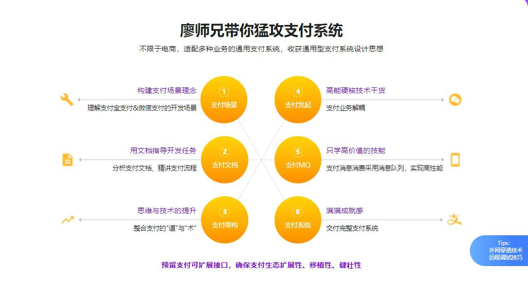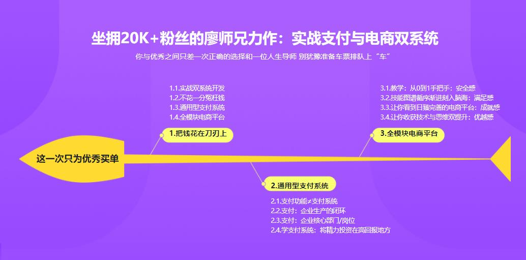 本课程将手把手带你实战双系统开发:全模块电商平台、通用型支付系统,打通SpringBoot2.x、MyBatis、MQ等技术栈知识壁垒,此外还略带小伙伴喜欢的硬核黑科技:内网穿透。