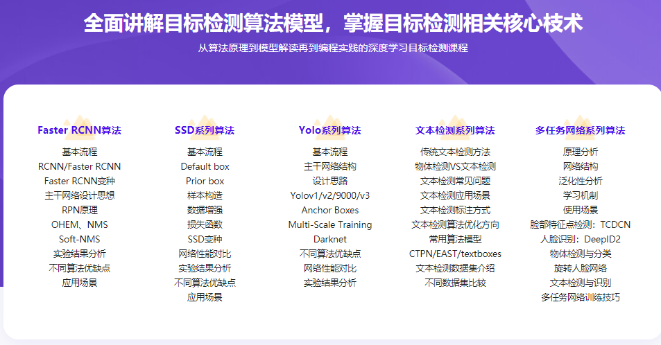 课程从算法角度出发,对各个模型进行全面细致的讲解,并结合人脸检测、物体检测、行人车辆检测、文本检测等项目,熟悉算法工程师在工作中会接触到的数据打包、网络训练、测试等问题,一步步带大家了解和完成目标检测实战案例,尽快进入深度学习领域。