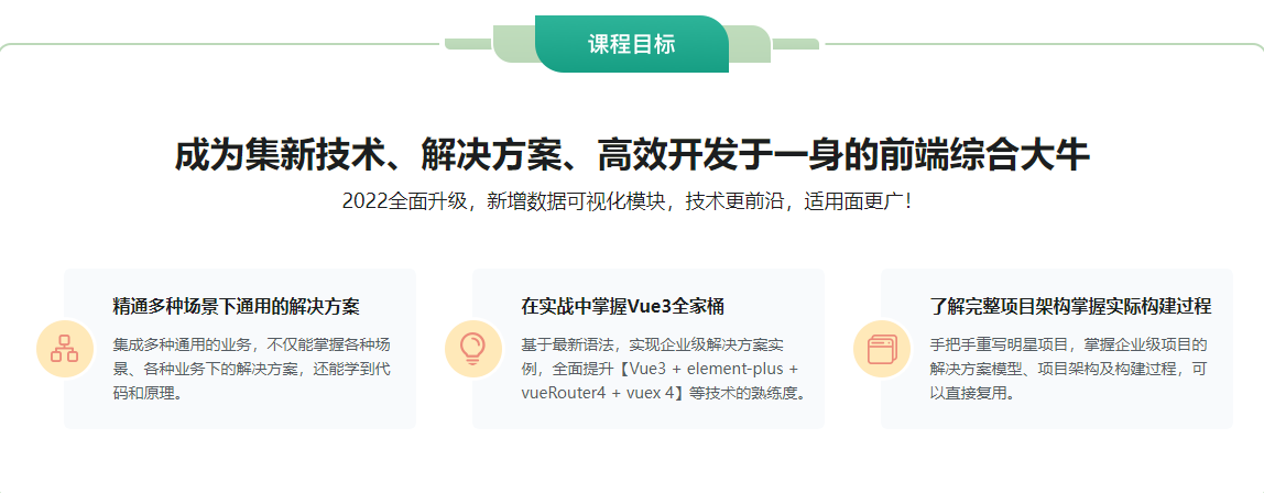 会编码的人有很多,能够提出解决方案的人少,想要高效开发,不仅要会编码,还要懂方案!本课程将基于Vue全新的 <script setup> 语法,手把手带你重写vue-element-admin,不仅能提升你策划方案的能力,更能解决场景众多、功能繁复的后台前端项目中的难题,助力你成为集技术、方案、高效开发于一身的综合性大牛!