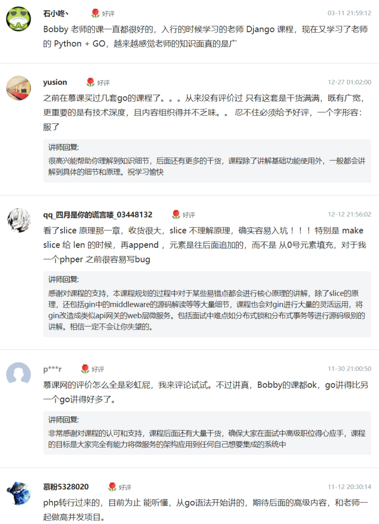 之前在慕课买过几套go的课程了。。。从来没有评价过 只有这套是干货满满,既有广宽,更重要的是有技术深度,且内容组织得并不乏味。。 忍不住必须给予好评,一个字形容:服了