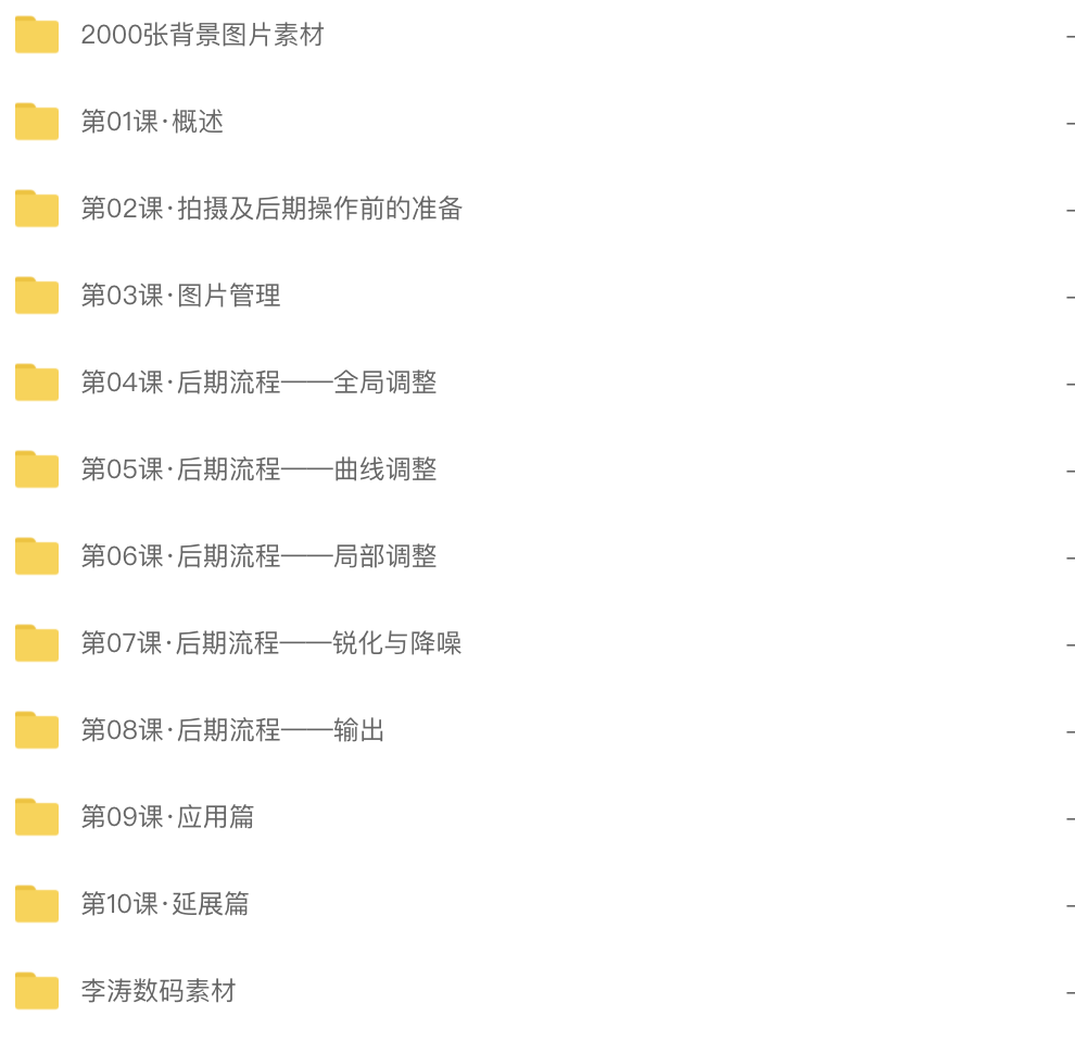 本套课程为摄影爱好者量身打造,帮助学习者形成后期思路,培养艺术通感,完善独立风格,为最终成为思维不受羁绊的个性摄影师开源铺路。