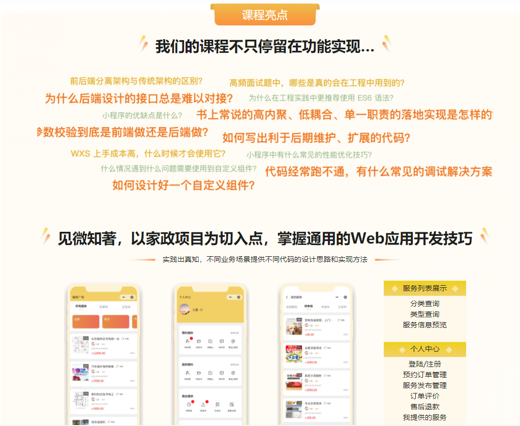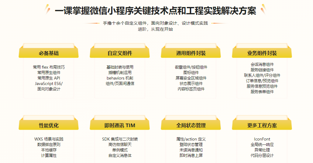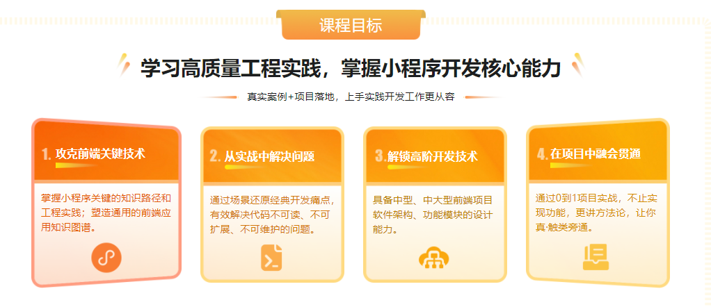 学习高质量工程实践,掌握小程序开发核心能力。学习没有速成,但可以很有技巧!本课程为你梳理关键知识脉络,通过经典开发场景还原,理清问题的来龙去脉,告别“实现了就好”、“维护不了”的困境;“封装”、“异步”、“架构设计”、“面向对象”等晦涩的名词不再神秘,让“可读性、可扩展性、可维护性”落地。