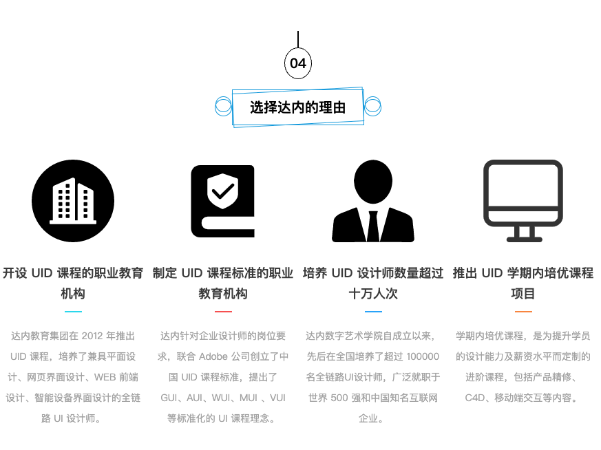 达内致力于面向IT互联网行业,培养软件开发工程师、测试工程师、系统管理员、智能硬件工程师、UI设计师、网络营销工程师、会计等职场人才。达内UID课程助你拥有“设计能力,前端能力,交互逻辑及产品思维”。