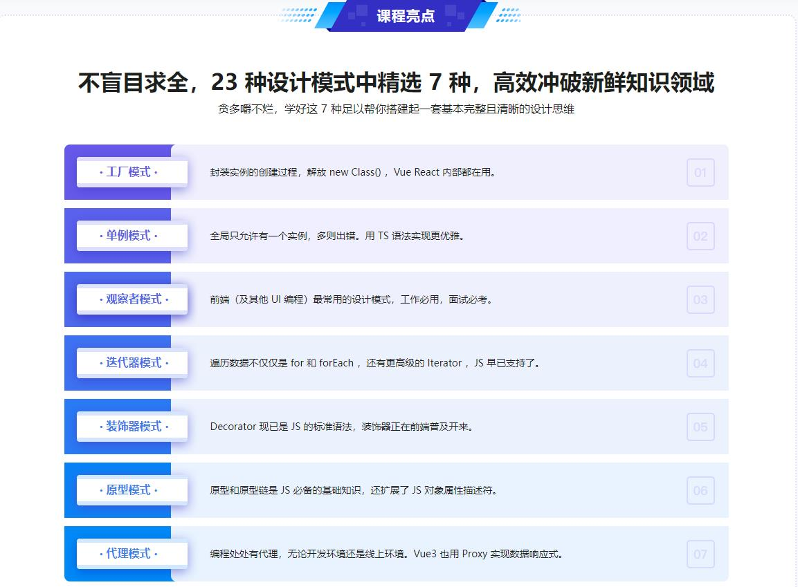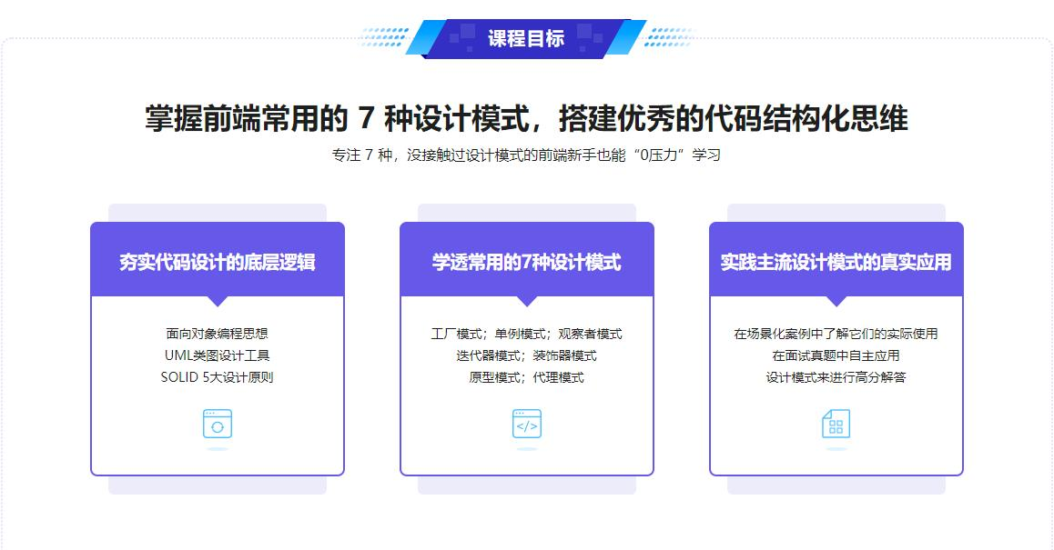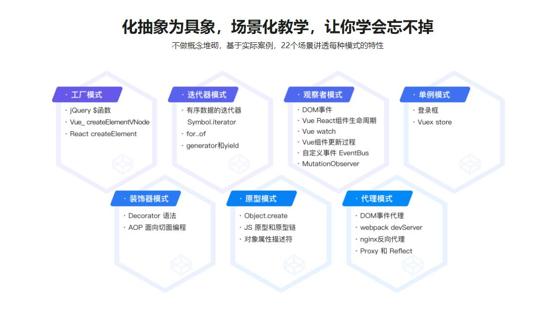 从“写代码”到“写好代码”到“设计代码”,不仅是技术的提升,更是编程思维的提升,其中最关键的就是设计模式。但很多人想学习设计模式时,往往是查到的资料一堆,有用的知识少见,学得云里雾里,难以实践。本课从23种设计模式中精选前端常用的7种设计模式,利用场景化实例教学,让想学的人真正学明白、会应用、能实践。