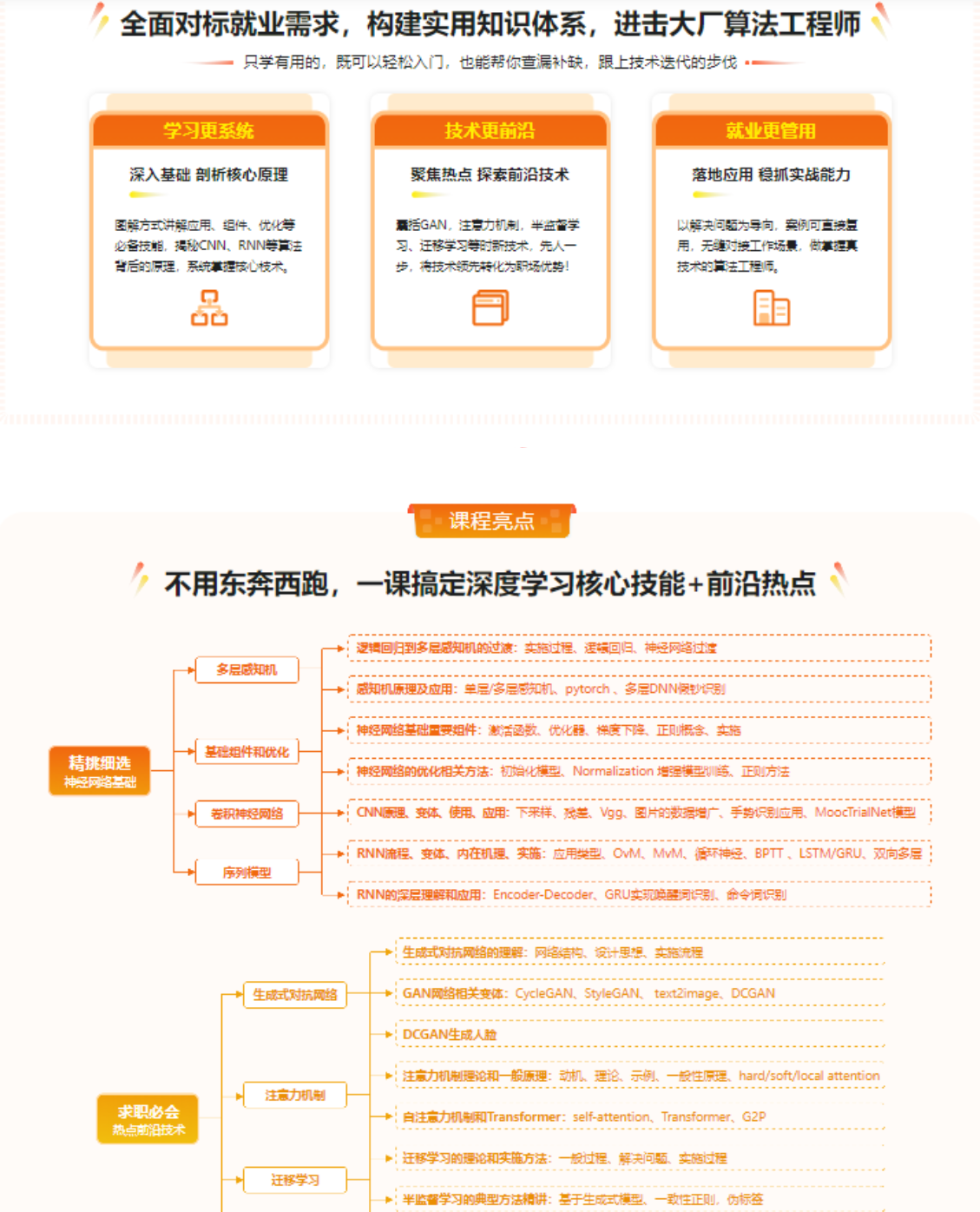 想要成为一名优秀的深度学习工程师并不容易,一看就会,一用就废,已然成为很多人进军AI 领域的心魔,自以为理解了框架、算法,但遇到实际问题却仍不知道该怎么解决。本门课程将结合核心基础、算法模型设计和实用案例,由浅至深、由理论到实操,带你紧跟行业热点,系统入门深度学习,掌握解决实际问题的能力,轻松畅游AI时代!