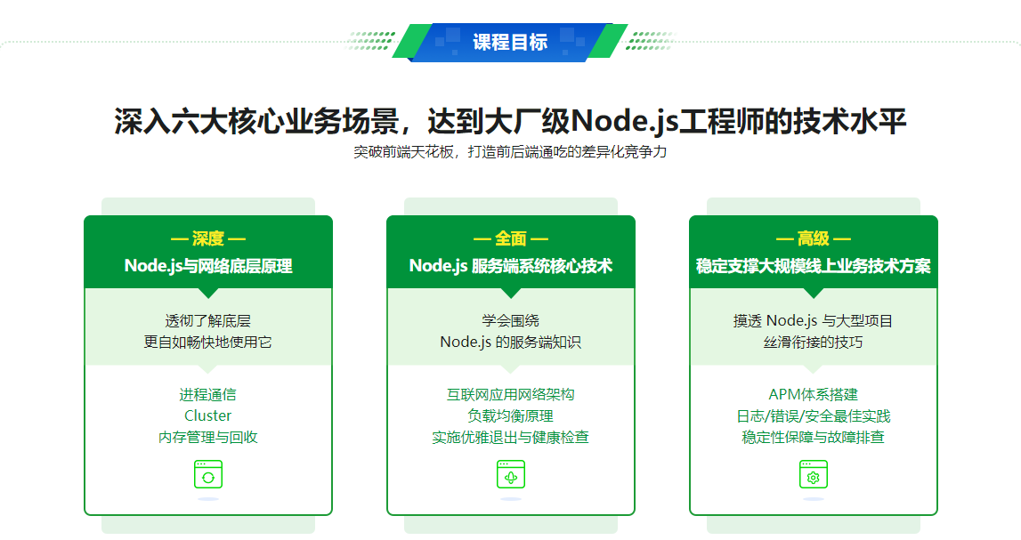 即使你会用 Node.js 开发小型项目后端系统,也只能说你掌握了它最基本的用法,并不足以打动大厂招聘官。因为,很多大厂选择 Node.js来承接服务端(BFF层),涉及的项目更为复杂,要求也更加精细,这需要前端既非常懂 Node.js 本身,也要懂其相关的服务端知识,才能更好地支撑大规模线上业务。本课程就带你学习BAT级别的 Node.js 用法,快速提升你在前端市场的区分度和竞争力。
