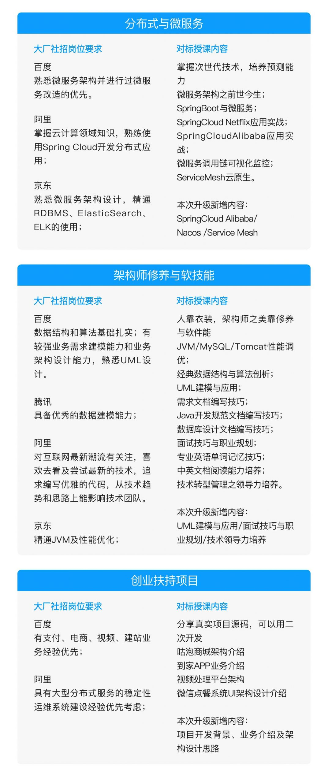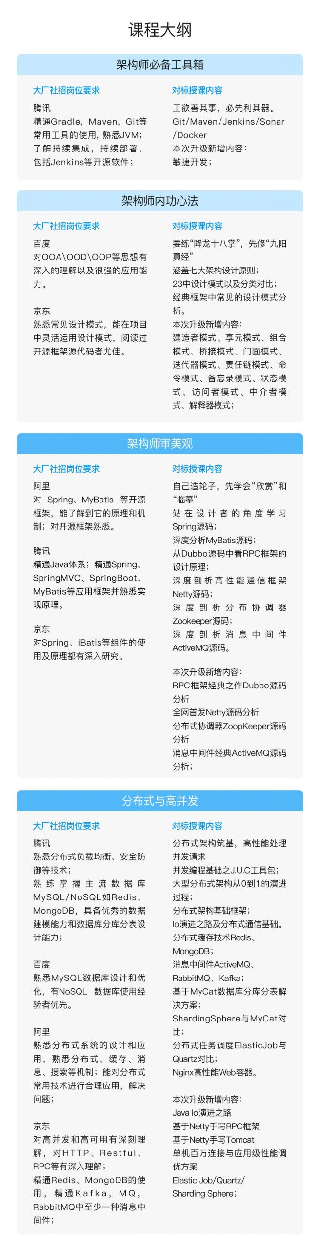 主要针对1到5年及以上工作经验的开发人员,提供互联网行业热门技术的Java架构师专题培训,由业内技术大牛,行业及实战经验丰富的讲师进行技术分享。内容涵盖redis,mongodb,dubbo,zookeeper,kafka 高并发、高可用、分布式、高性能、并发编程等技术。