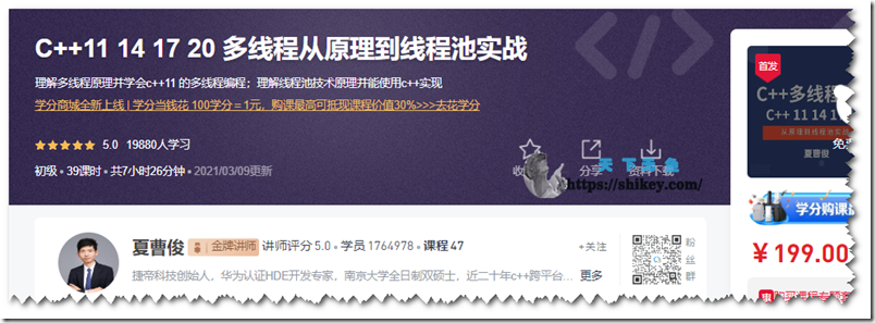————\计算机教程QTDLG\17-51CTO\088-【夏曹俊26869】C++11 14 17 20 多线程从原理到线程池实战 ├─1-1 课程介绍.mp4 15.33MB ├─1-2 为什么要使用多线程_第一个线程代码示例.mp4 25.19MB ├─1-3 thread 对象生命周期和线程等待和分离.mp4 26.46MB ├─1-4 全局函数作为线程入口分析参数传递内存操作.mp4 23.17MB ├─1-5 线程函数传递指针和引用.mp4 22.49MB ├─1-6 使用成员函数作为线程入口并封装线程基类接口.mp4 39.77MB ├─1-7 lambda临时函数作为线程入口.mp4 14.21MB ├─2-1 多线程的状态及其切换流程分析.mp4 10.49MB ├─2-2 竞争状态和临界区介绍_互斥锁mutex代码演示.mp4 21.37MB ├─2-3 互斥锁的坑_线程抢占不到资源原因和解决方法.mp4 16.3MB ├─2-4 超时锁timed_mutex和可重入锁recursive.mp4 32.76MB ├─2-5 共享锁shared_mutex解决读写问题.mp4 24.21MB ├─3-1 手动实现RAII管理mutex资源_锁自动释放.mp4 21.62MB ├─3-2 c++11RAII控制锁lock_guard.mp4 26.66MB ├─3-3 unique_lock可临时解锁控制超时的互斥体包装器.mp4 34.94MB ├─3-4 C++14shared_lock共享锁包装器.mp4 12.9MB ├─3-5 c++17scoped_lock解决互锁造成的死锁问题.mp4 36.76MB ├─3-6 项目案例线程通信使用互斥锁和list实现线程通信.mp4 51.84MB ├─3-7 条件变量应用场景_生产者消费者信号处理步骤.mp4 26.99MB ├─3-8 condition_variable代码示例读写线程同步.mp4 43.84MB ├─3-9 条件变量应用线程通信解决线程退出时的阻塞问题.mp4 30.22MB ├─4-1 promise和future多线程异步传值.mp4 28.55MB ├─4-2 packaged_task 异步调用函数打包.mp4 31.33MB ├─4-3 async创建异步线程替代thread.mp4 32.9MB ├─4-4 c++多核计算分析并实现base16编码.mp4 49.9MB ├─4-5 c++11实现多核base16编码并与单核性能测试对比.mp4 46.51MB ├─4-6 c++17for_each多核运算示例编码base16.mp4 53.24MB ├─4-7 线程池实现步骤说明.mp4 19.23MB ├─5-1 完成线程池的初始化和启动.mp4 23.35MB ├─5-2 完成线程池任务调度.mp4 30.31MB ├─5-3 完成线程池退出并等待任务处理结束利用lambada表达式.mp4 25.14MB ├─5-4 线程池中在在运行的任务数量获取使用atomic原子变量.mp4 10.14MB ├─5-5 使用智能指针管理线程对象和任务对象的生命走起.mp4 25.35MB ├─5-6 异步获取线程池中任务执行结果.mp4 13.95MB ├─5-7 基于线程池实现音视频批量转码测试任务.mp4 36MB ├─5-8 完成线程池案例基于ffmpeg工具多线程转码视频.mp4 20.54MB ├─6-1 c++20屏障barrier实现线程协调.mp4 21.37MB ├─6-2 课程总结.mp4 3.83MB ├─list.txt -1.#INDB └─资料.zip 71.95MB