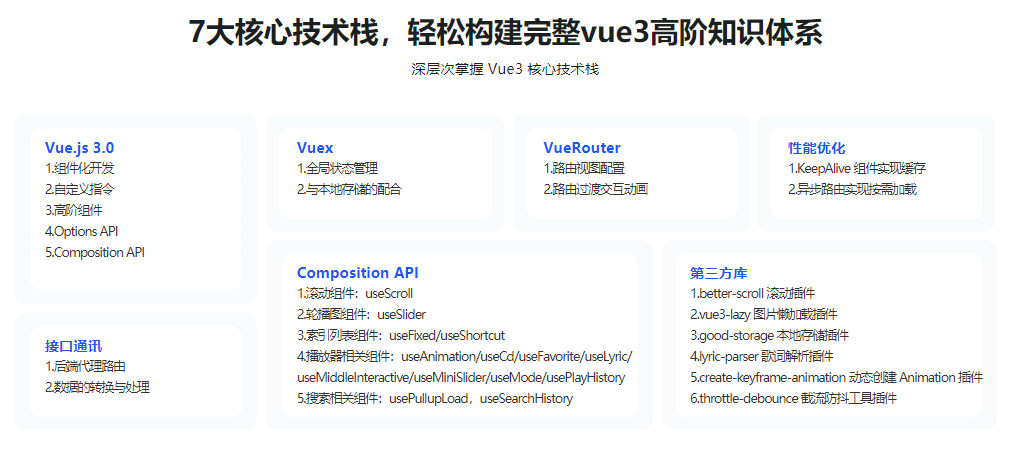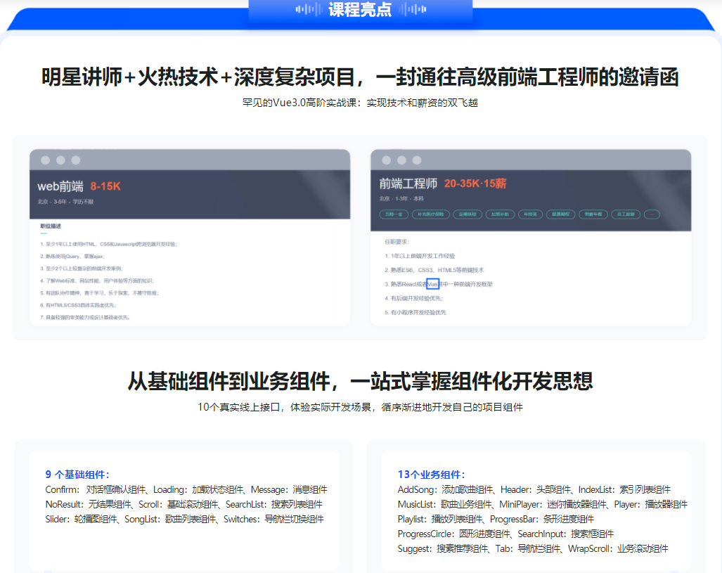 企业对Vue技术的要求越来越高,但掌握vue3.0高深技术的人才却很少。本课程将通过编写出一个真实的,高度还原音乐播放器的复杂前端项目,让你在实战中获得一线大厂vue3.0高级技术实际开发经验,助你在面试中脱颖而出。