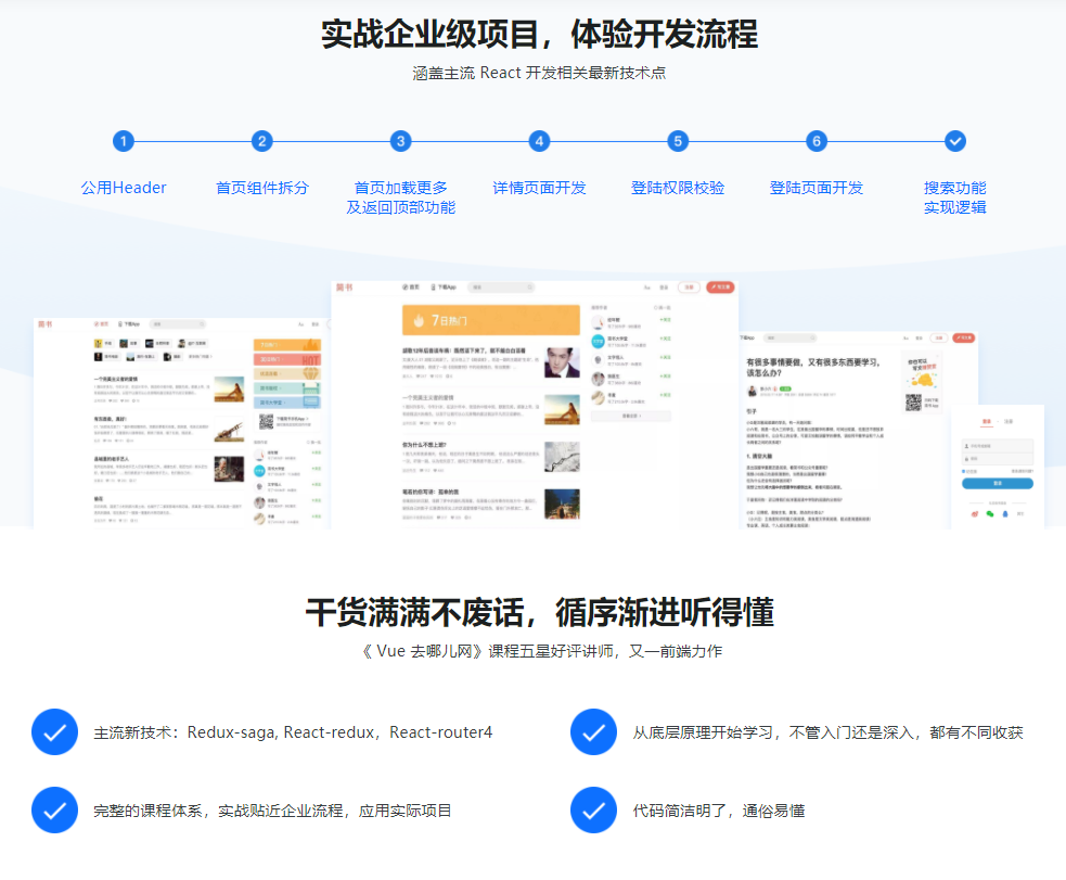 本课程通过对简书项目进行实战开发,从基础原理逐步深入讲解React中的主流技术以及实战中的应用。课程讲解全部使用React16最新语法,让同学们全方位理解应用React构建项目,直接上手中级以上难度React项目开发。
