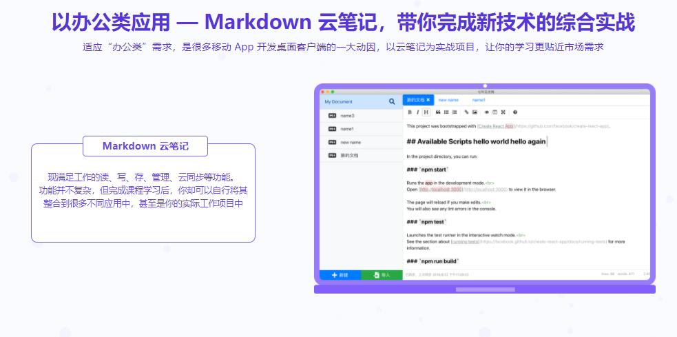 目前市场上对 Electron 的呼声很高,它几乎是 Web 开发人员开发桌面客户端的唯一途径,很多大厂都使用 Electron 开发自己的原生应用。Electron 天生适配任何前端开发框架,我们结合 React Hooks 这个炙手可热的新特性进行教学,同时因为 Electron 也可以使用 Node.js 的开发环境,所以我们同时使用七牛云和很多 Node 原生模块进行开发,来完成一个非常有吸引力的云同步 Markdown 文档管理应用。