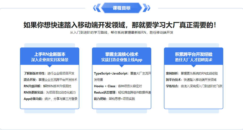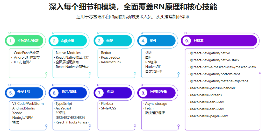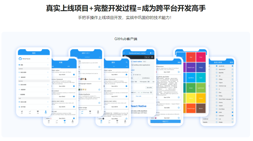 本课程将带你解锁React Native开发应用新姿势,一网打尽React Native新版本热门技术;课程中老师会手把手带你开发并打包上线一款完整的跨平台App;让你拥有一次真正参与上线项目开发的历程,同时全面掌握React Native核心技术,让你的技术能力和项目经验都得到前所未有的提升!【技术储备要求:1.具备JavaScript、ES5,ES6,React 前端基础;2.具备ReactNative技术基础(语法,环境搭建);3.了解XCode、AndroidStudio开发工具使用】