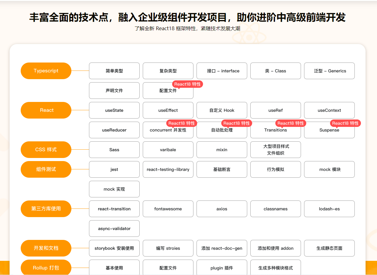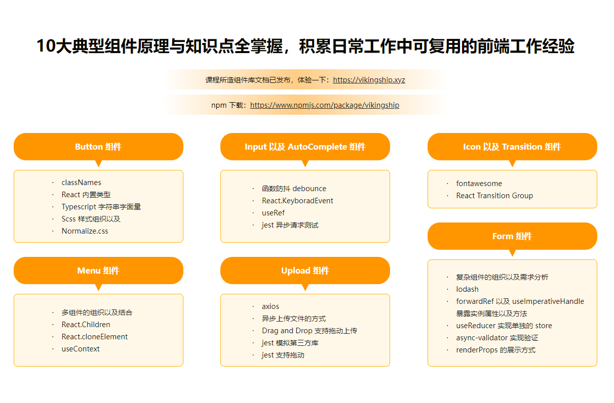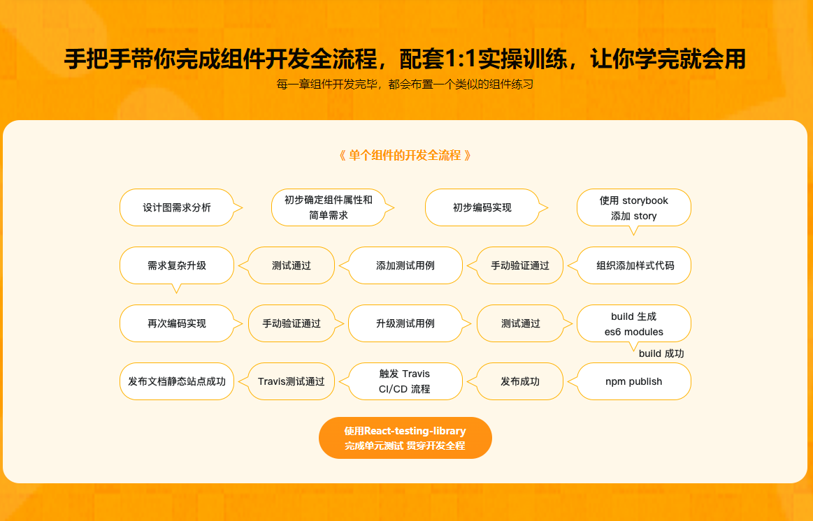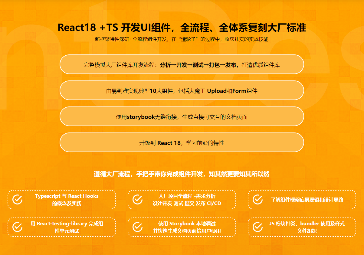 同学们在学习了一门技术的基础知识后,怎样持续提升这门技术达到更高水平?怎样写出高质量符合大厂要求的代码?写什么样的项目才能提高实力和扩大影响力?本课程给出了答案:真实模拟大厂开发大型开源项目的流程,从零到一高仿 AntD 使用 Typescript 和 React 开发自己的组件库,在这其中穿插了一系列的知识点: 大型项目的样式组织,react 组件测试,react 动画实现。开发完毕还实现了模块化打包,代码发布再到 CI/CD 的全流程。