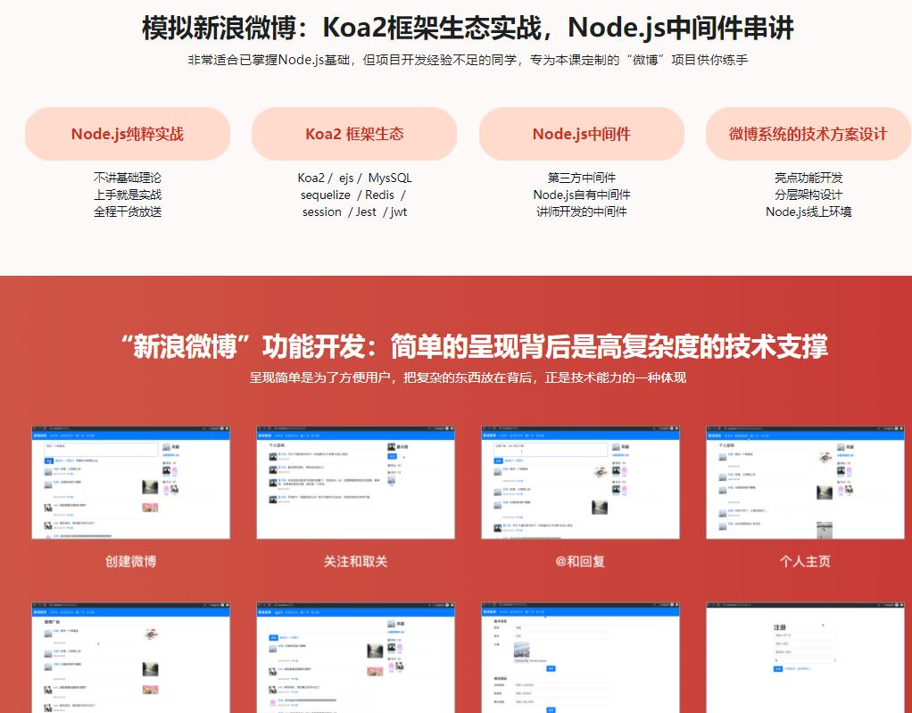 课程为纯实战项目,从零模拟开发一个基本功能完备的微博系统(包括注册、登录、关注和取关,微博浏览、创建和回复,及 @ 关注人等各个功能),带你完成整个Koa2框架生态的综合技术实战,包括各类中间件,MySQL数据库设计,微博项目架构等诸多干货内容,最后带你回顾整个开发过程,从技术层面总结 Node.js 的最佳实践经验