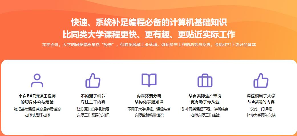 计算机基础方面的知识。对于一些非科班出身的同学来讲,一直是他们心中的痛,而对于科班出身的同学,很多同学在工作之后,也意识到自身所学知识的不足与欠缺,想回头补补基础知识。关于计算机基础的课程很多,内容繁杂,但无论是相关书籍还是大学课程,都有点脱离工作,有鉴于此,讲师结合自己多年工作经验,总结出了这套更适合程序员的计算机基础知识课程,带你更快的补足编程必备基础知识