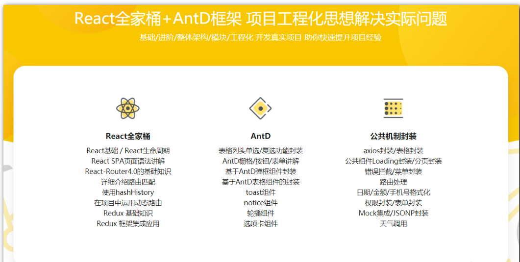 课程结业学员“静雅”评价: 很实用, 每个知识点都很认真的讲解,对react结合antd的使用很有帮助, 之前生疏的router,redux以及antd的属性做了一个查缺补漏。个人是倾向画质清晰,吐字音质标准的课程讲解,这大大提高了我对这个课程的兴趣和积极性。 期待老师的下一个作品!!!