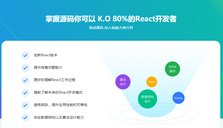 React毫无疑问是前端界主流的框架,而框架本身就是热点。课程以讲解React实现原理为主,并在实现过程中讲解这么做的原因,带来的好处以及规避了哪些问题。理解源码之后对于React开发过程中出现的一系列问题都可以非常轻松得进行解决,也是能力提升,晋升高级开发工程师的必备技能。