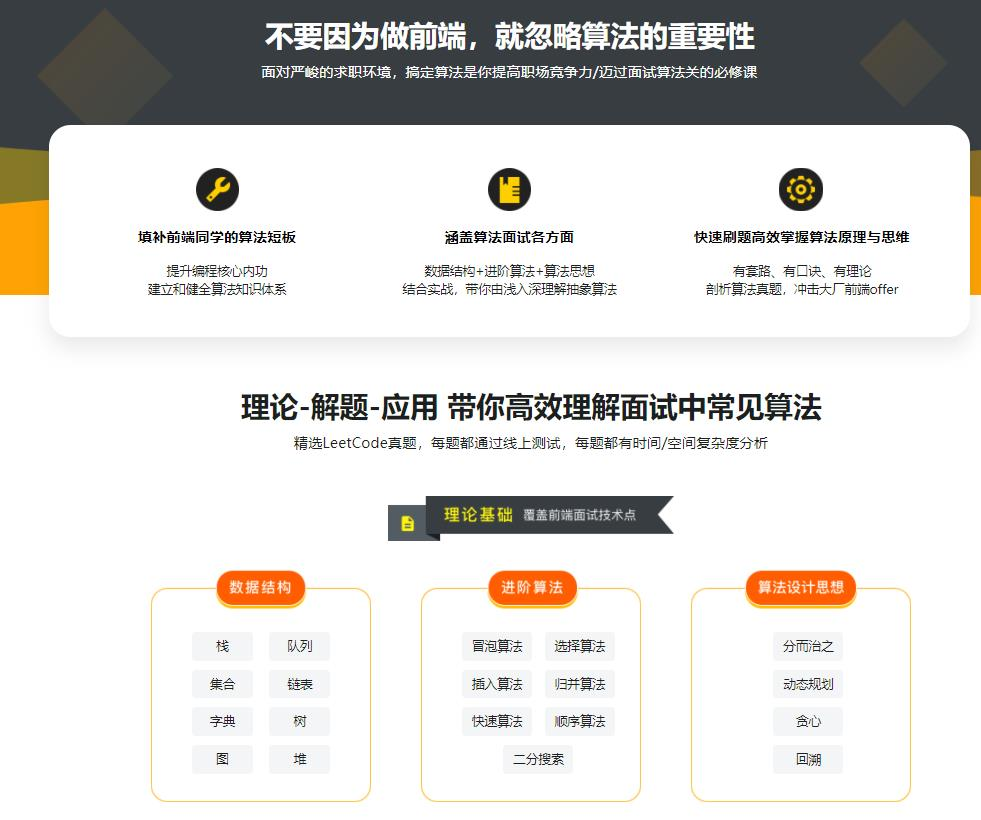 通过讲解 LeetCode 真题来讲述数据结构与算法,动画展示和流程图展示让算法的思想跃然纸上,更好理解。通过这门课的学习可以帮助找工作的同学快速准备算法相关的题目,助力高薪offer。