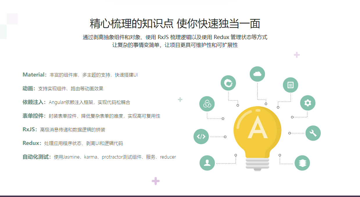 学习 Angular 进阶知识点和技巧(Material、动画、依赖注入、表单控件、RxJS,Redux、自动化测试等),打造一个企业协作平台应用,让你在Angular领域独当一面,具备开发复杂应用的能力。