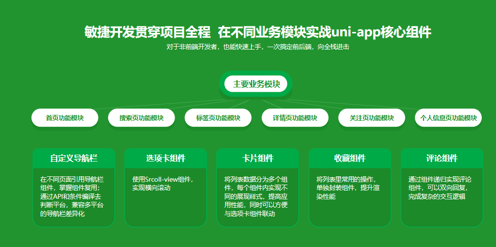 跨端框架uni-app作为新起之秀,在不到两年的时间内,迅速被广大开发者青睐和推崇,得益于它颠覆性的优势,——“快”,快到可以节省7套代码。本课程由uni-app开发者团队成员亲授,带领大家无障碍快速掌握完整的uni-app跨端应用流程。并且搭配最佳的生态工具,HBuilderX和uniCloud,体验高效全栈开发。并且,讲师全程传授当下主流的开发概念——敏捷开发思路与技巧,带你时刻走在技术前沿。