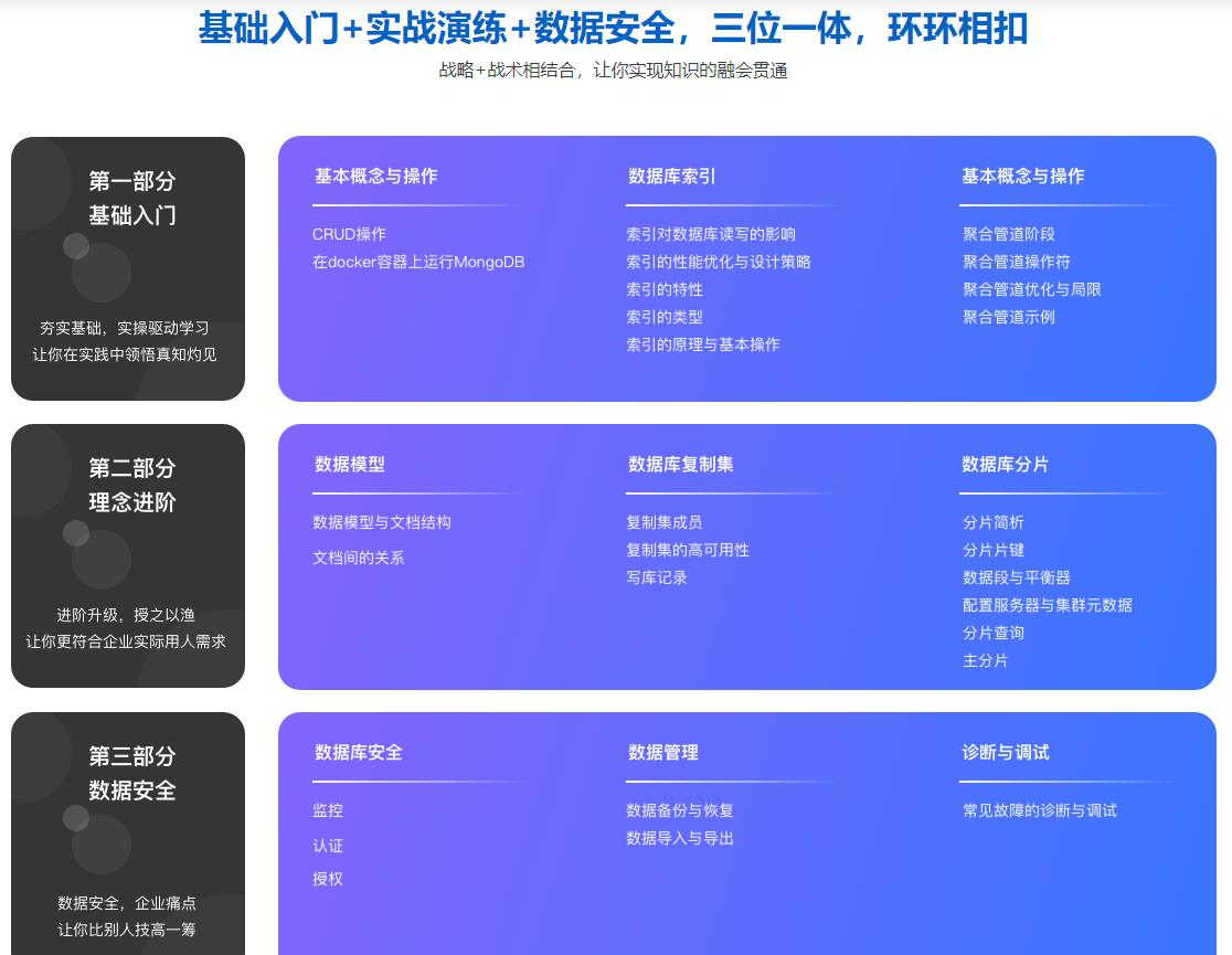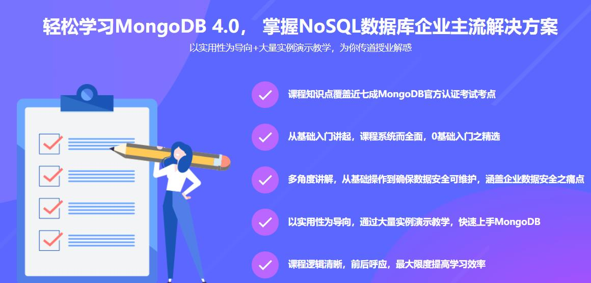 MongoDB凭借着其灵活性,可扩展性,强大的查询语言以及优异的性能,成为了众多开源项目和企业应用的主流选择。本课程采用渐进式教学,带领同学从零基础到进阶:课程涵盖众多知识点,带你步步为营,全面掌握NoSQL数据库解决方案。让你从小白到达人:最终助你快速成长为一名符合企业用人需求的人。