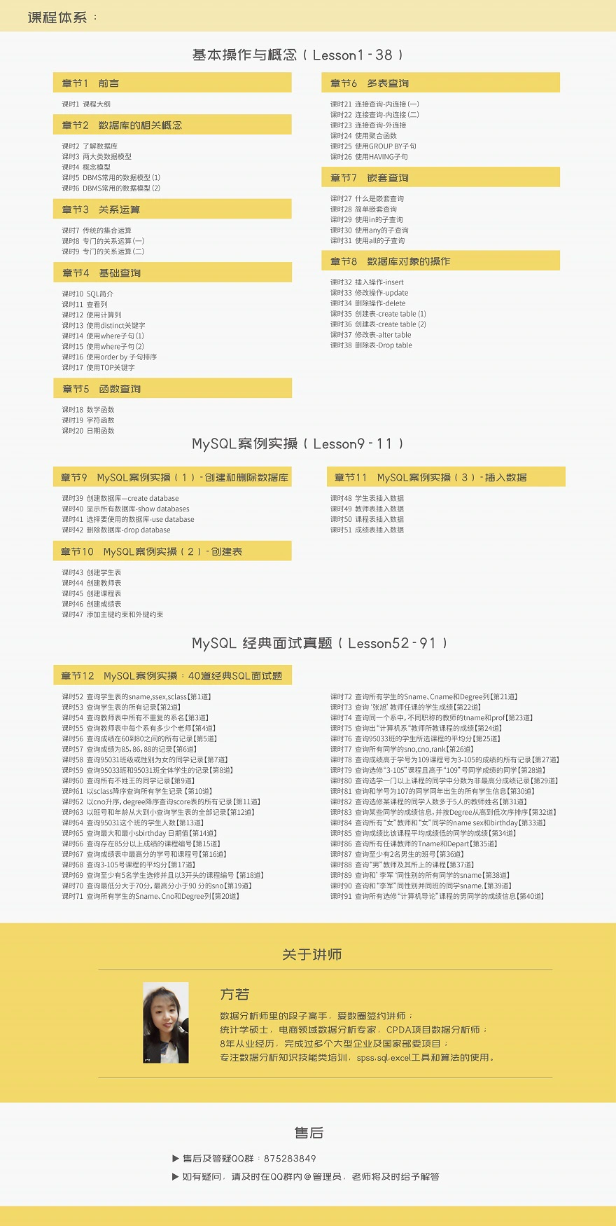 当前位置: 首页后端开发正文 适用人群 针对SQL零基础,想要学习SQL,或者系统学习SQL的学员 课程概述 本课程是图文教程+视频教程 声明:本站所有资料均来源于网络以及用户发布,如对资源有争议请联系微信客服我们可以安排下架! 阿小白会员 收藏 海报 链接