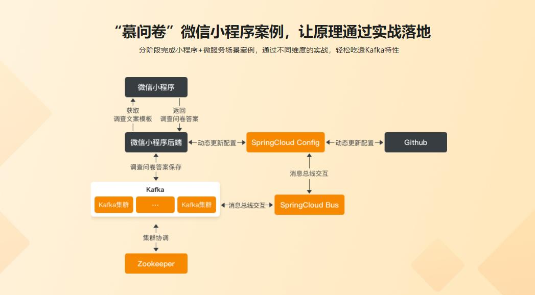 现在我们趁热打铁,对前面所学的知识做一个综合实战。这里主要锻炼Producer的使用。完成“慕问卷”的小程序后端与Kafka的交互。