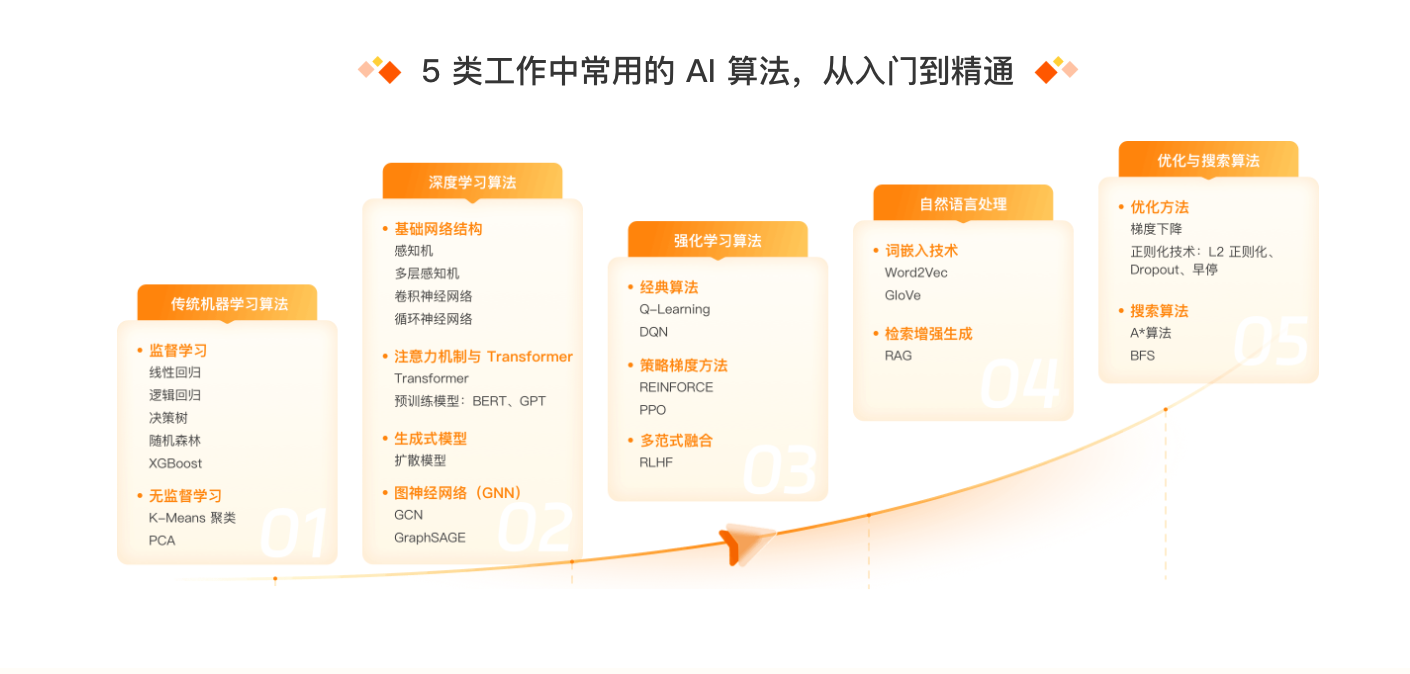 ● 完整 AI 技术栈:从数学基础、机器学习、深度学习、强化学习到生成式 AI