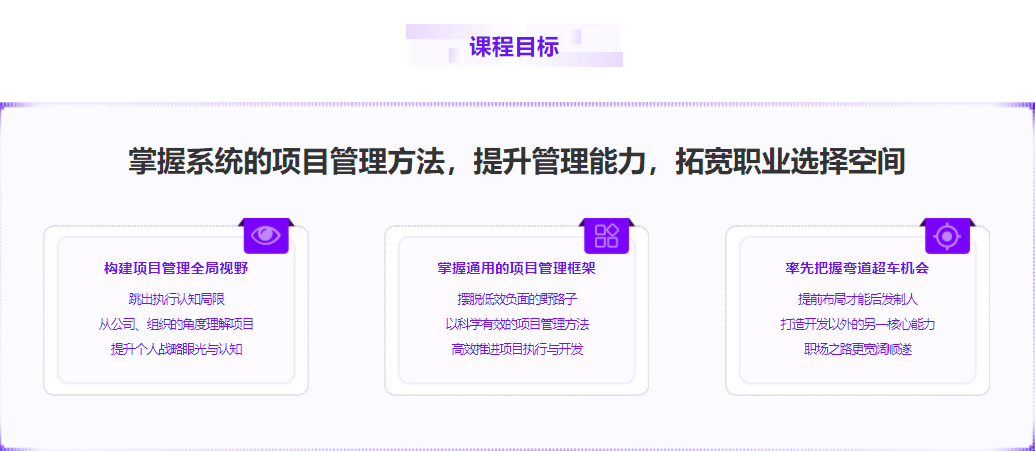 本章会介绍本课程不是一套普通的项目实战,而是一门项目管理职业实战课程。通过学习项目管理, 突破职业瓶颈,拓宽职业路线。